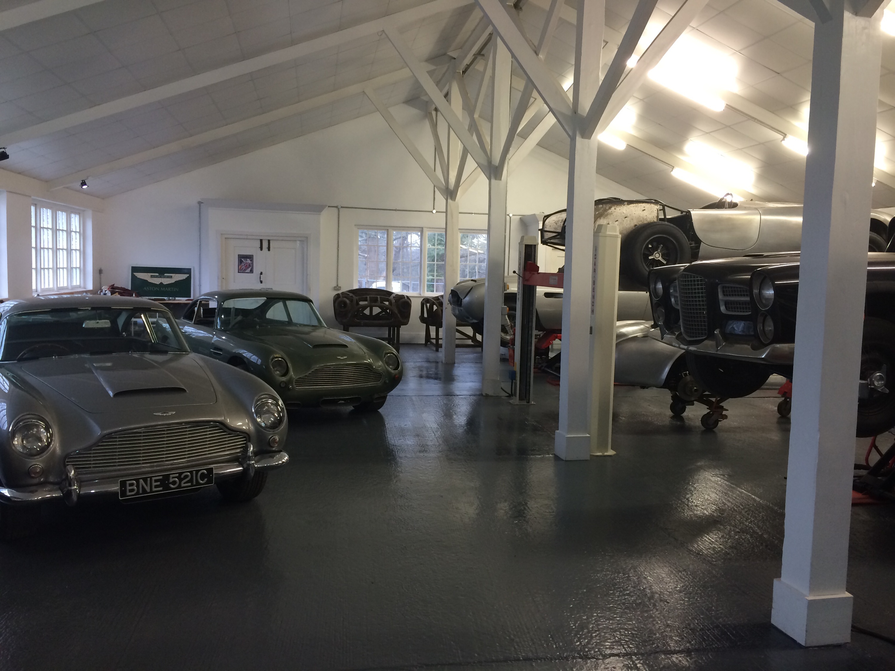 Aston Martin DB3 and 5 with a Facel Vega on a lift and assorted dismantled AC’s in the old dining room of the Members Restaurant – now Brookland Motor Company’s smart works.